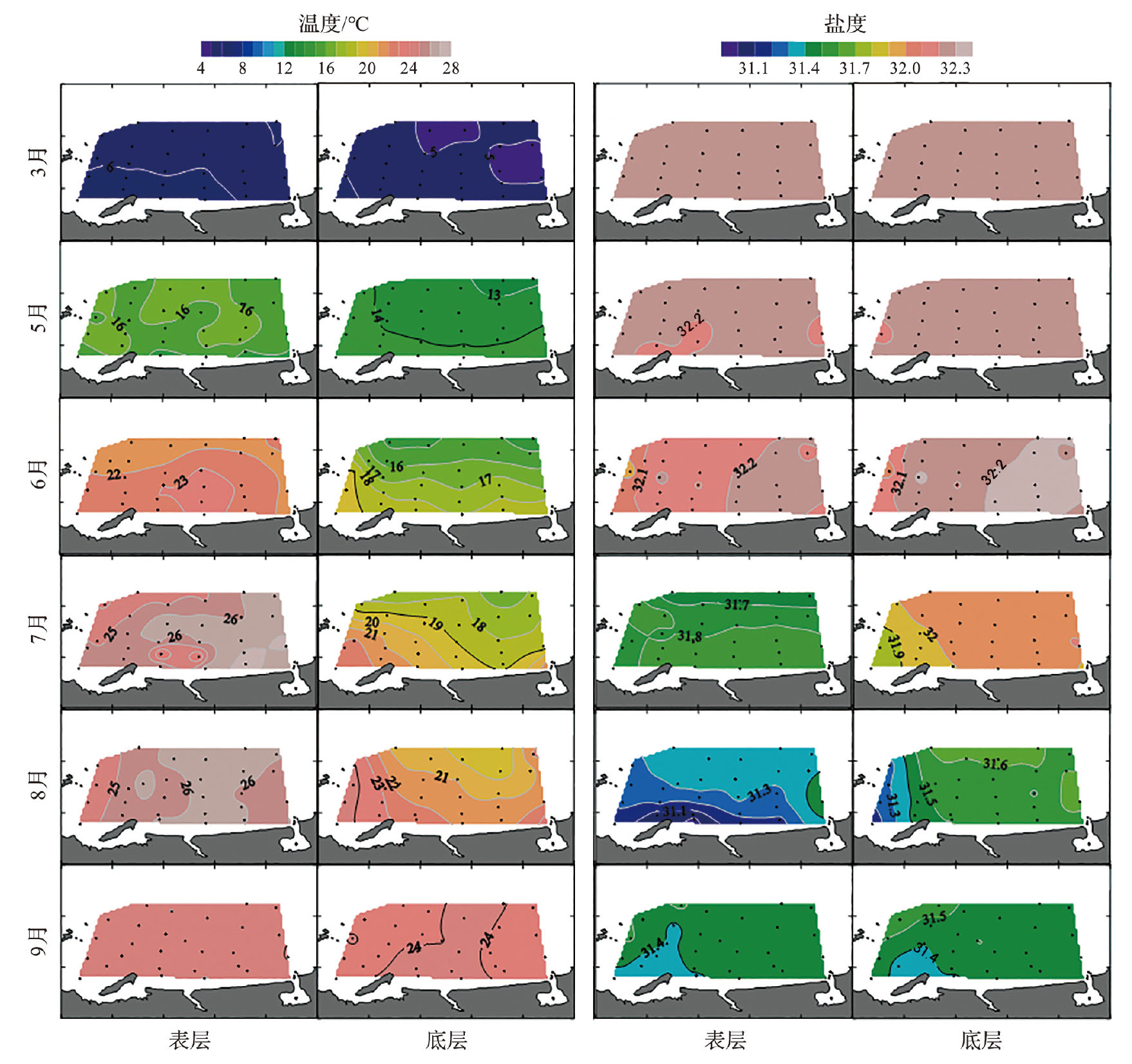 | 6月 | 表层 | 32.16±0.07 | 22.30±0.70 | 0.46±0.22 | 0.38±0.24 | 0.67±0.29 |