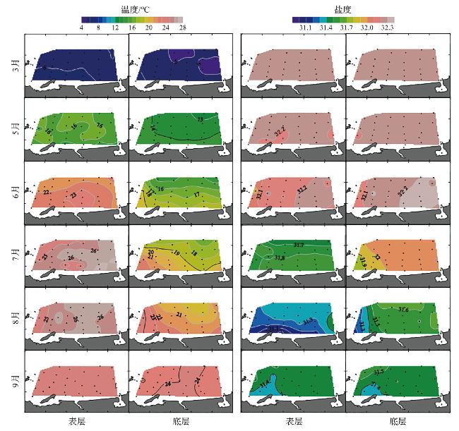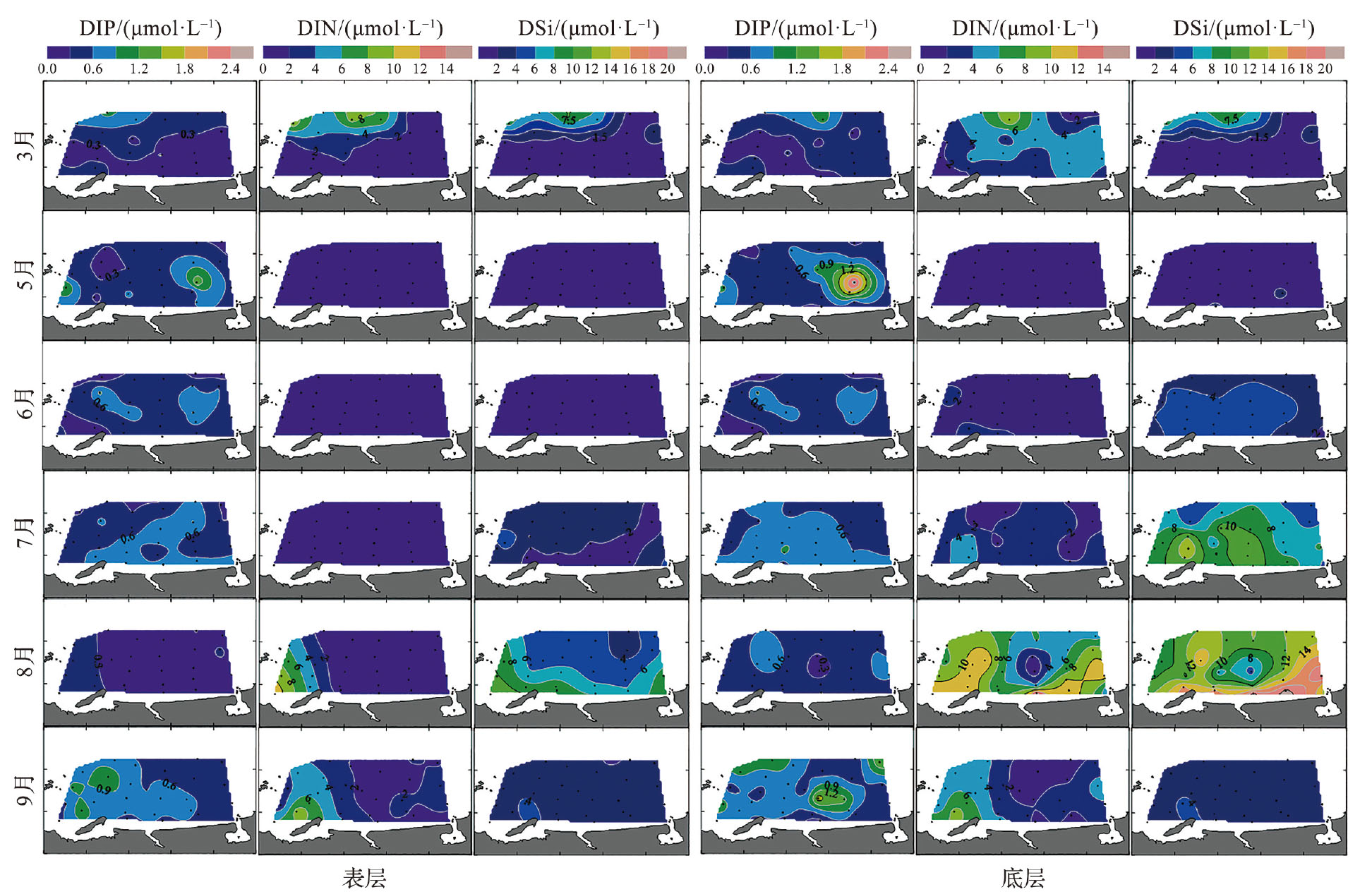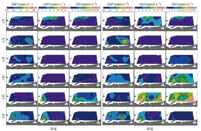 | 月份 | 层位 | 盐度 | 温度/℃ | DIP /(μmol·L-1) | DIN /(μmol·L-1) | DSi /(μmol·L-1) |