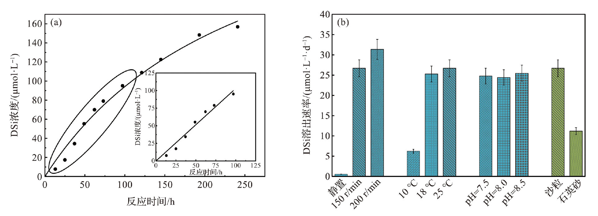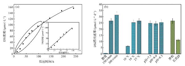 图5 25℃, 150 r·min-1条件下沙粒硅溶出(a)以及不同反应条件下沙粒和石英砂硅溶出(b)Fig.5 Evolution of dissolved silicic acid concentration during incubation of sand permeable particles with seawater at 25℃, 150 r·min-1 (a), results of the dissolution of silicate from sandy permeable particles and quartz sand under different reaction conditions (b) |
