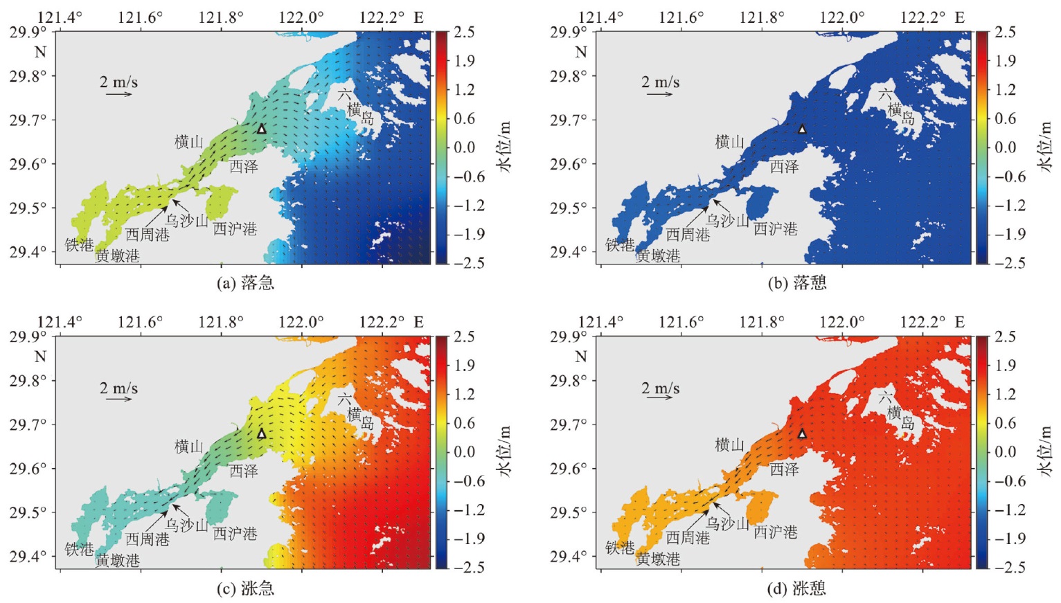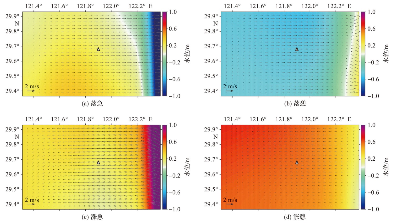 图6 理想矩形区域试验流场图(三角符号为判定落急、落憩、涨急和涨憩4个典型时刻的基准站。) Fig.6 Flow field of ideal rectangular experiment (The triangular symbol is the reference station for determining the four typical moments of ebb strength, ebb slack, flood strength and flood slack.) |