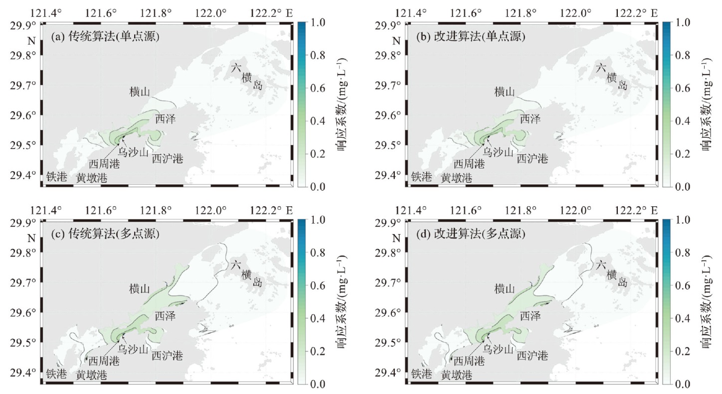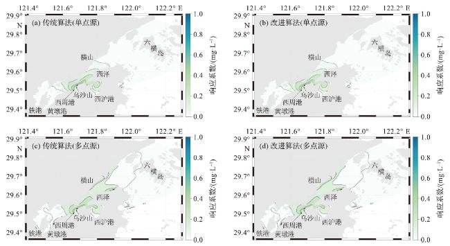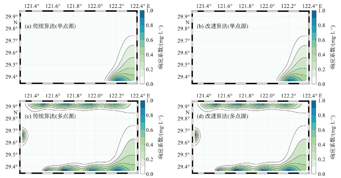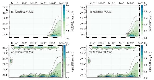 图9 象山港研究区中使用不同方法模拟单点源(a,b)和多点源(c,d)响应系数场(试验6)(改进算法和传统算法所得结果完全一致。) Fig.9 The response coefficient fields of single point source (a, b)and multiple point sources (c, d)in the Xiangshan Bay study area using different methods (experiment 6) (The results of improved algorithm case and original case are identical.) |
