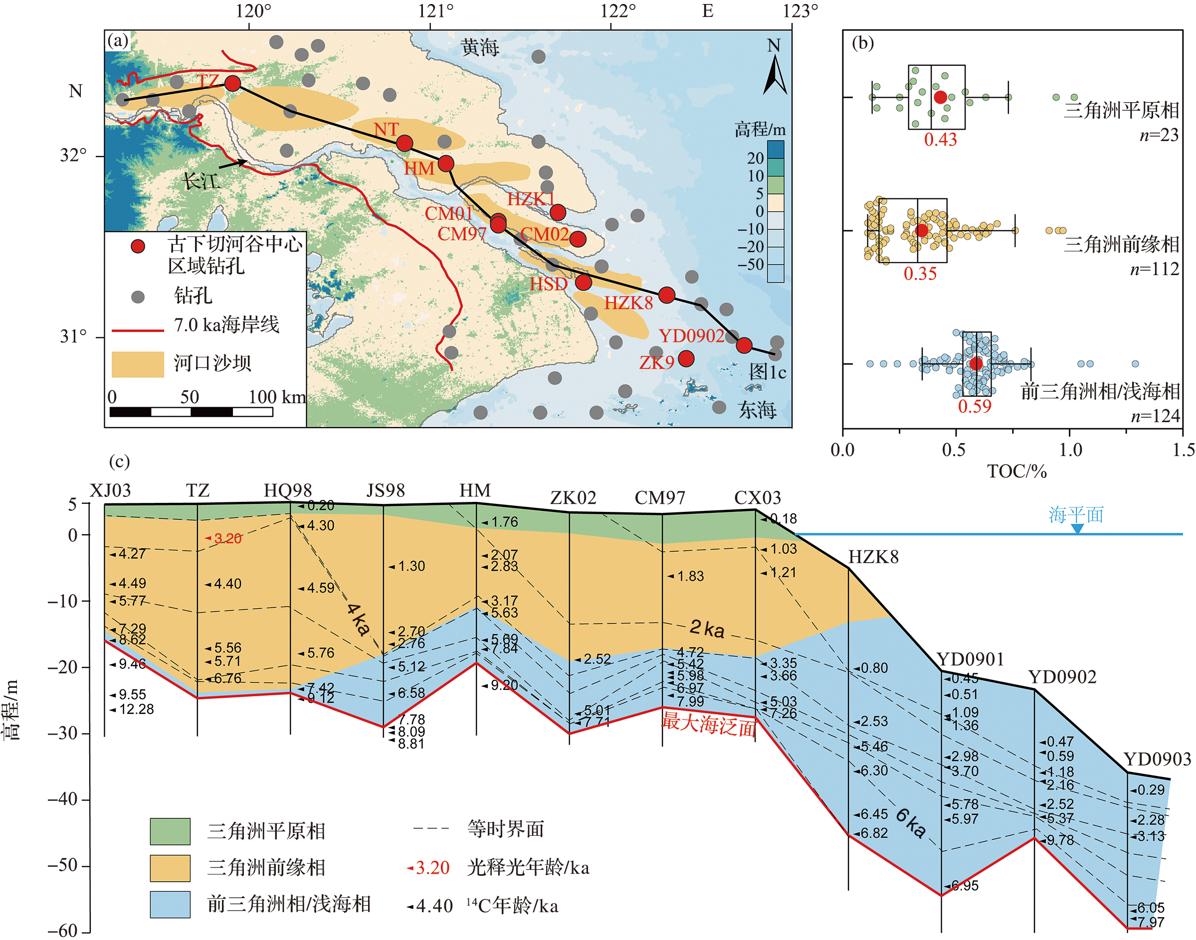 图1 长江三角洲区域概况及钻孔分布图(a)、长江三角洲沉积亚相总有机碳含量分布箱式图(b)以及长江三角洲沉积层序剖面图(c)(图1b中的彩色散点为实测数据,箱形图与红点分别展示了统计分布及均值。) Fig.1 Overview of the Changjiang Delta region and boreholes distribution map (a), box plot of total OC content distribution in subfacies of the Changjiang Delta (b), and sedimentary sequence profile of the Changjiang Delta (c) (In Fig.1b, colored scatter points represent measured data; boxplots and red dots show the statistical distribution and mean values, respectively.) |