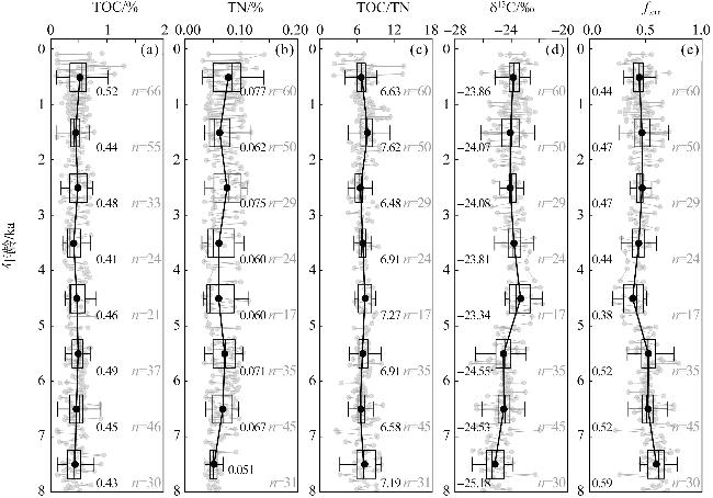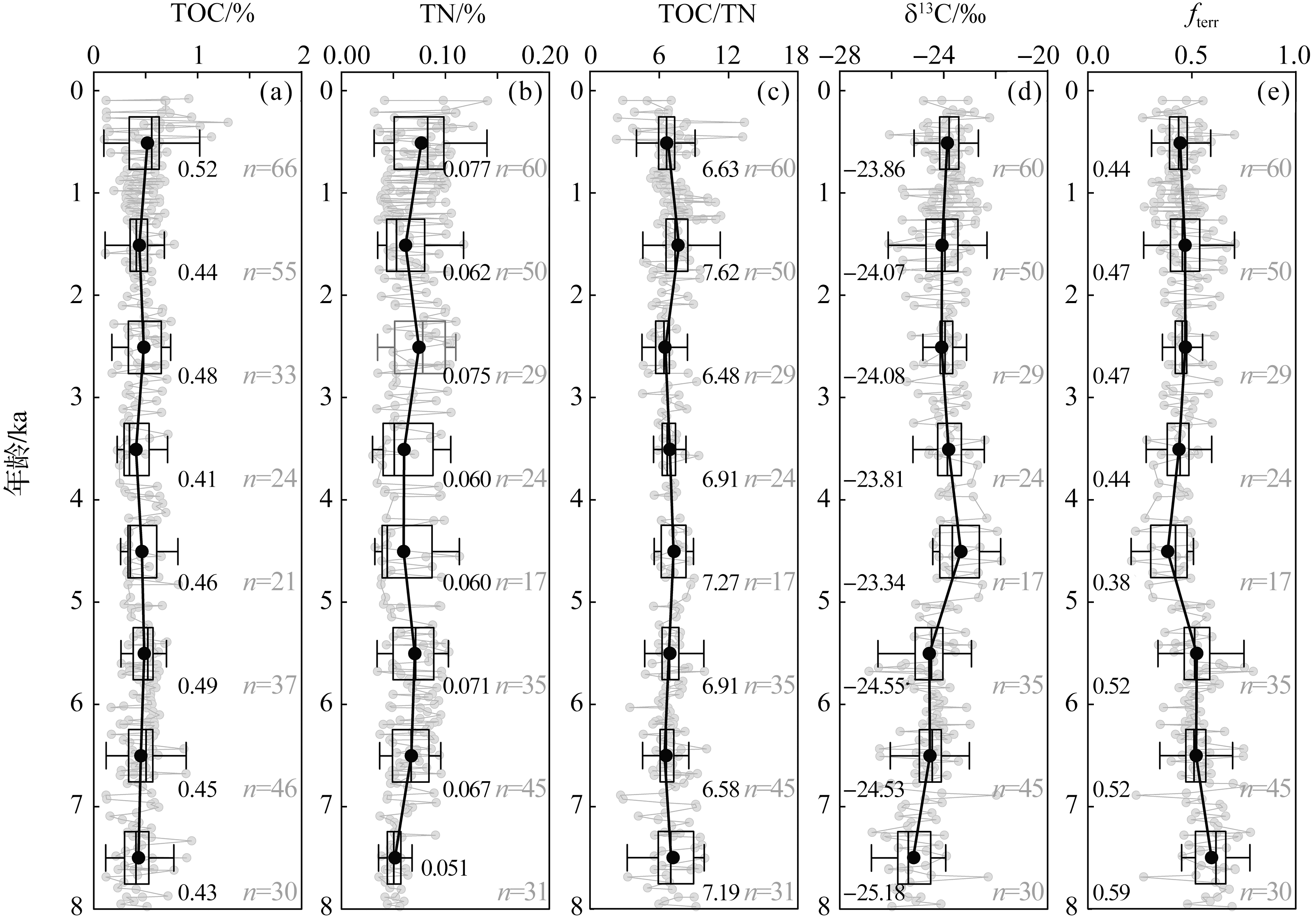 图3 全新世长江三角洲沉积物中TOC含量(a)、TN含量(b)、TOC/TN(c)、δ13C(d)和fterr(e)的变化特征(灰色散点为实测数据,箱形图与黑点分别展示了千年尺度的统计分布及均值。) Fig.3 Variation characteristics of TOC content (a), TN content (b), TOC/TN (c), δ13C (d), and fterr (e) in the Holocene sediments of the Changjiang Delta (Gray scatter points represent measured data; boxplots and black dots show the millennial-scale statistical distribution and mean values, respectively.) |
