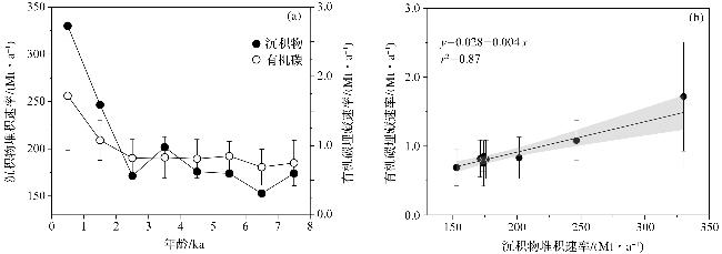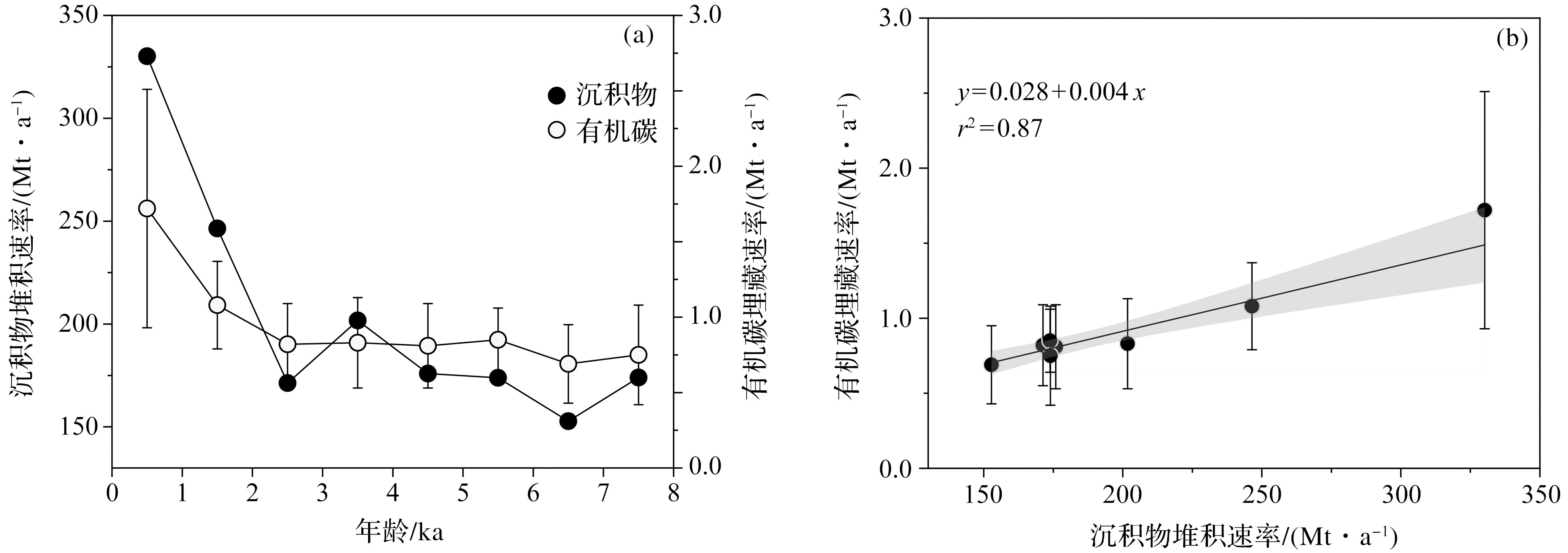 图4 长江三角洲8 ka BP以来沉积物堆积速率与有机碳埋藏速率的演化特征(a)及其相关性分析(b)Fig.4 Evolution characteristics of sediment burial rate and OC burial rate since 8 ka BP in the Changjiang Delta (a) and their correlation analysis (b) |