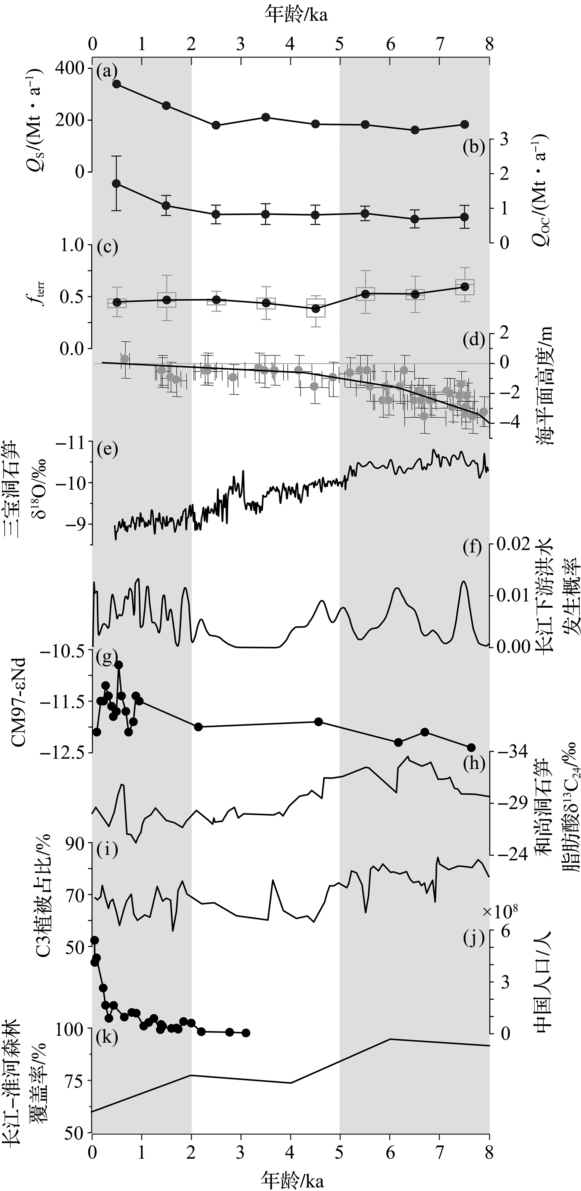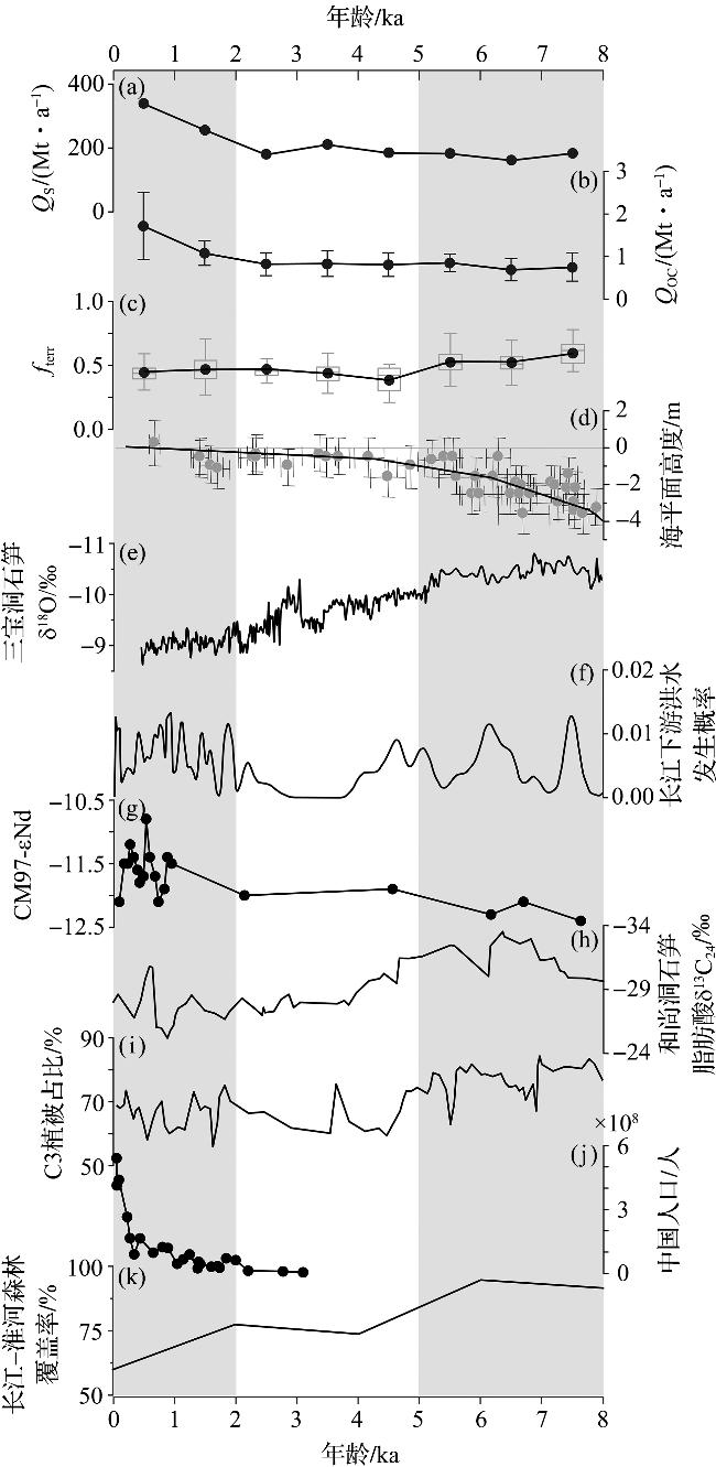 图5 长江三角洲全新世有机碳来源变化及其控制因素(a:长江三角洲的沉积物堆积速率;b:有机碳埋藏速率;c:陆源有机碳贡献比例;d:长江三角洲地区全新世相对海平面变化曲线[40];e:三宝洞石笋δ18O值[41];f:长江下游流域洪水发生概率[42];g:长江三角洲CM97孔钕同位素异常值[43];h:长江上游和尚洞长链脂肪酸碳同位素值[44];i:长江下游南漪湖长链正构烷烃指示的C3植物对沉积有机碳的贡献[45];j:中国人口变化[46];k:长江-淮河流域全新世森林覆盖变化[47]。图中两个灰色阴影区域分别表示人类活动增强的2~0 ka BP 时期和中全新世大暖期。) Fig.5 Holocene variations in OC sources and their control factors in the Changjiang Delta (a:Sediment burial rate, b: OC burial rate, c: Terrestrial OC fraction in the Changjiang Delta; d: Relative sea-level curve of the Changjiang Delta region in the Holocene[40]; e: Stalagmite δ18O from Sanbao Cave[41]; f: Flood probability in the lower Changjiang basin[42]; g: εNd values in core CM97 from the Changjiang Delta[43]; h: Long-chain fatty acid δ13C from Heshang Cave in the upper Changjiang basin[44]; i: Sedimentary OC contribution from C3 plants indexed by long-chain n-alkanes at Lake Nanyi in the lower Changjiang basin[45]; j: Population in China[46]; k: Changes in forest cover during the Holocene for the Changjiang-Huaihe region[47]. The two gray shade zones highlight the two special stages: 2-0 ka BP with enhanced human activities and the mid-Holocene Thermal Maximum.) |
