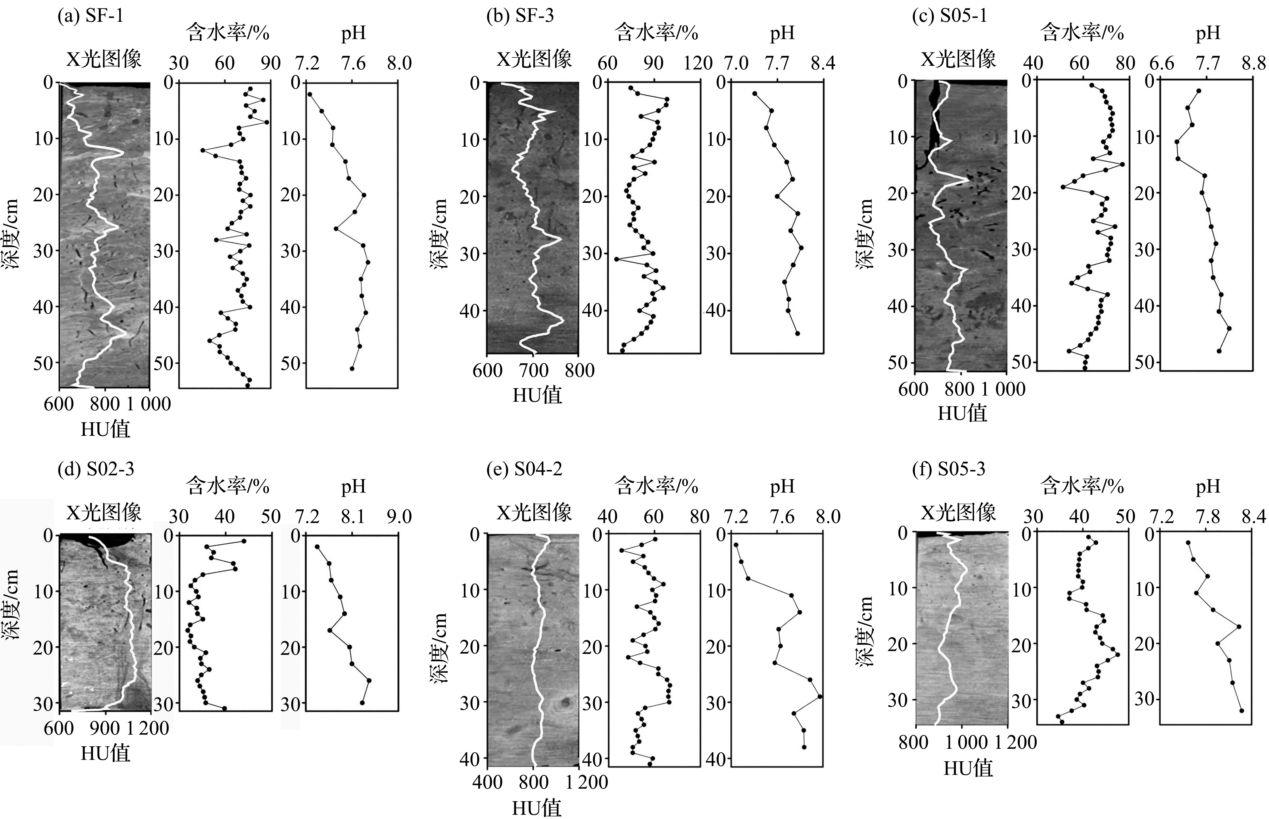 从垂向分布特征来看(图2),6根岩心的粒径、含水率和pH值整体变化相对稳定。岩心SF-1、SF-3和S05-1的X光灰度图颜色较深,表明沉积物粒径较细,对应的HU值较低,多数小于800;相比之下,岩心S02-3、S04-2和S05-3的X光灰度图颜色较浅,表明沉积物粒径较粗,HU值较高,多数大于800。部分岩心呈现出明显的孔隙结构,可能为生物扰动形成的虫孔,如岩心SF-1、SF-3和S05-1,其灰度图呈块状构造,层理不发育;相较而言,岩心S02-3、S04-2和S05-3中黏土-细粉砂(黑色)和粗粒砂-粗粉砂(白色)纹层呈周期性交替出现,基本未见明显生物扰动痕迹。
