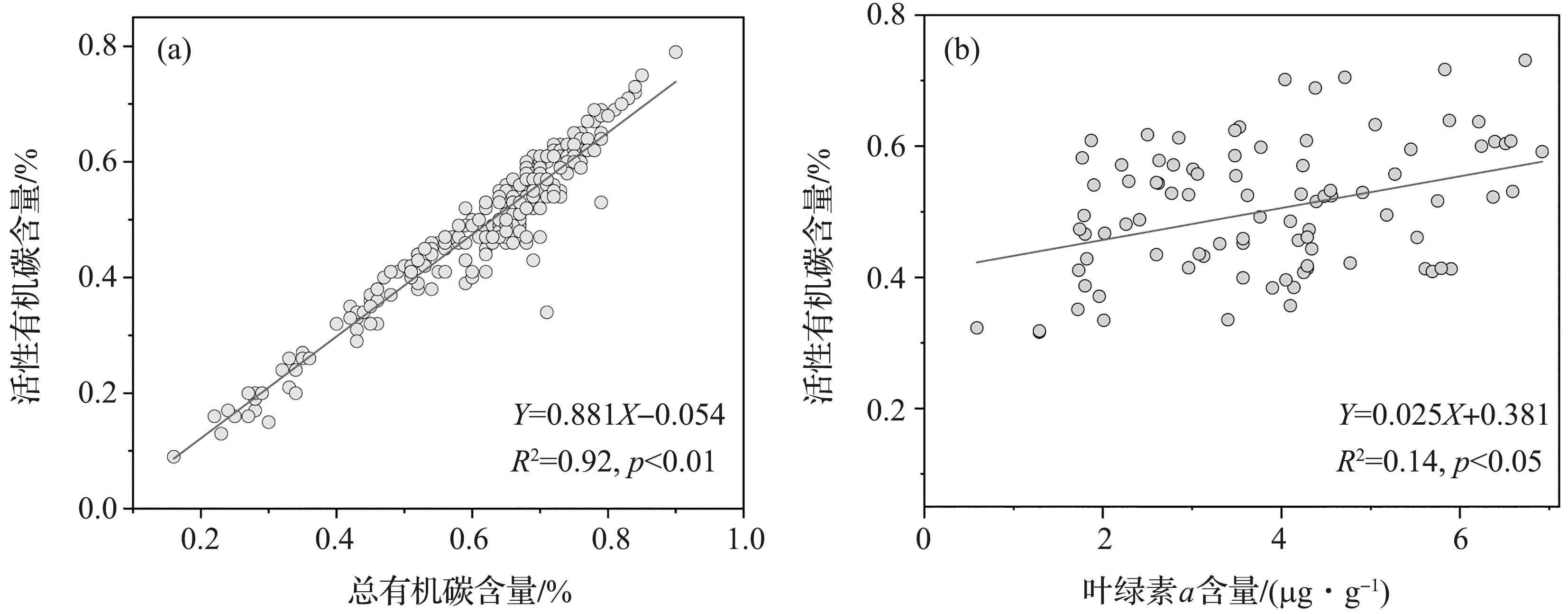 基于上述背景,本文进一步分析了各岩心活性有机碳含量与叶绿素a含量的关系(图4)。结果显示二者间的相关性较弱(R2=0.14,p<0.05),表明叶绿素a所代表的新鲜有机质(如藻类和微生物残体)可能在沉积早期被快速消耗或转化为更稳定的有机质,而非直接进入沉积有机碳库。这种微弱相关性可能源于生物活动对有机质转化的间接促进效应,但该效应的显著性远低于总有机碳本身的作用。尽管叶绿素a含量能够反映水体中初级生产力及新鲜有机质的输入水平,但其对沉积物中活性有机碳含量的直接贡献仍然有限。