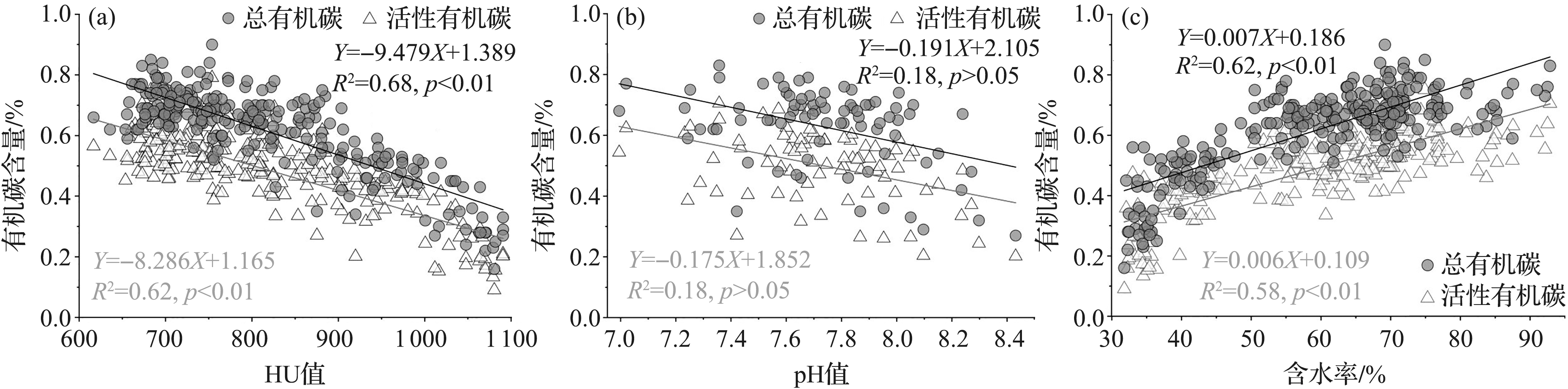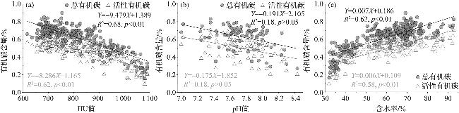 含水率是表征沉积物样品水分含量的重要指标。白光润等[23]指出,在相同积水条件下,空气湿度低、温度高时,有机碳分解速率会加快;张文菊等[24]研究表明,有机碳矿化速率对含水量变化敏感。本研究结果显示,含水率与活性有机碳含量呈显著正相关(R2=0.58,p<0.01,图5c),且在70%左右的含水率下,活性有机碳含量相对较高。这可能由于高含水率可限制氧气向沉积物深部扩散,形成厌氧环境,从而抑制好氧微生物对活性有机碳的完全矿化,使其在沉积物中积累。同时,高含水率环境有利于细颗粒黏土矿物(如蒙脱石、伊利石)膨胀,形成更多微孔隙,通过物理吸附或化学键合包裹小分子有机碳,减少其与微生物的接触机会[25]。然而,活性有机碳的长期保存仍需综合考虑其他因素,如黏土矿物和铁锰氧化物的保护、沉积速率及海洋沉积动力环境等。