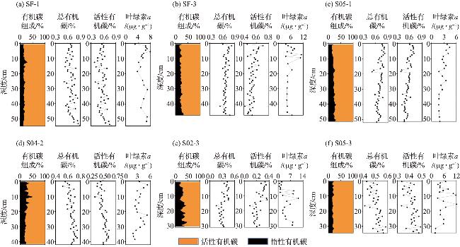 各沉积物岩心的活性有机碳含量在一定范围内变化:SF-1为0.40%~0.79%,SF-3为0.41%~0.71%,S05-1为0.41%~0.70%,S04-2为0.34%~0.62%,S02-3为0.13%~0.37%,S05-3为0.33%~0.49%。垂向分布特征显示:SF-1、S04-2和 S05-3的活性有机碳含量自底层向表层总体呈下降趋势,而SF-3、S05-1和S02-3则呈上升趋势。活性有机碳含量的垂向变化与总有机碳含量呈现高度一致的变化趋势(图3)。此外,各岩心活性有机碳占总有机碳的比例整体在51%~88%之间,在SF-1中占比最高,在S02-3中占比最低。