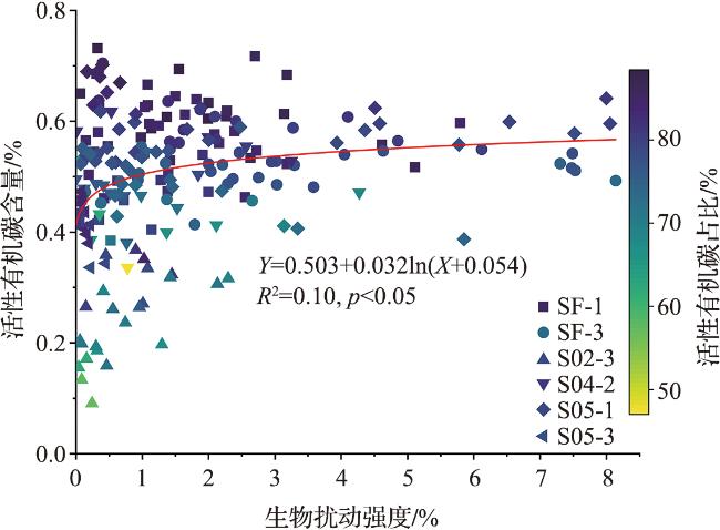 为进一步探讨生物扰动强度对沉积物中活性有机碳含量的影响,本研究统计分析了二者之间的相关关系(图6)。结果显示,活性有机碳含量总体上随生物扰动强度增强而略有上升,然后渐渐趋于平衡,但相关性不显著;与此同时,活性有机碳占总有机碳的比例随扰动增强亦呈现出一定的增加趋势。当生物扰动强度处于0~2%区间时,生物扰动的增强可能通过改变沉积物物理结构,增加孔隙度和氧气渗透,为好氧微生物降解有机碳创造有利条件,从而可能产生更多易分解的活性碳组分;同时生物本身的新陈代谢产物(如排泄物、分泌物)亦可作为高效的活性有机碳来源。当生物扰动强度处于2%~8%区间时,随着扰动增强,在产生新活性有机碳的同时,也可能加速了已有有机碳的矿化分解,导致“产生”与“消耗”达到一个新的动态平衡。这也间接表明生物扰动确实是影响活性有机碳含量的一个显著因素,但并非唯一主导因子。