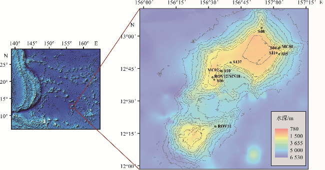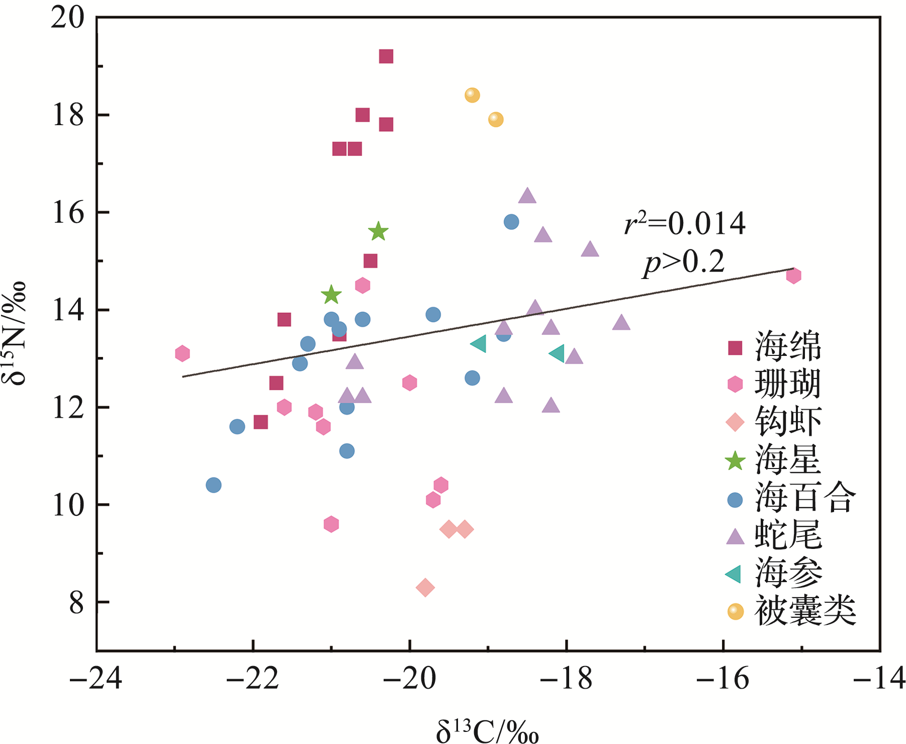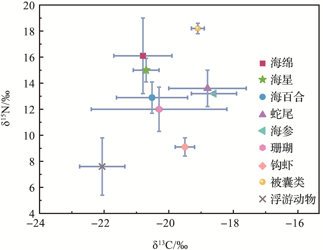 表1 维嘉海山巨型底栖生物各类群的稳定同位素(δ13C和δ15N)值Tab.1 Stable isotope (δ13C and δ15N) values of megabenthos in the Weijia Guyot |
