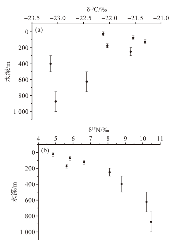 图3 浮游动物δ13C (a) 和 δ15N (b)的垂直分布Fig.3 Vertical distribution of δ13C (a) and δ15N (b) for zooplankton |