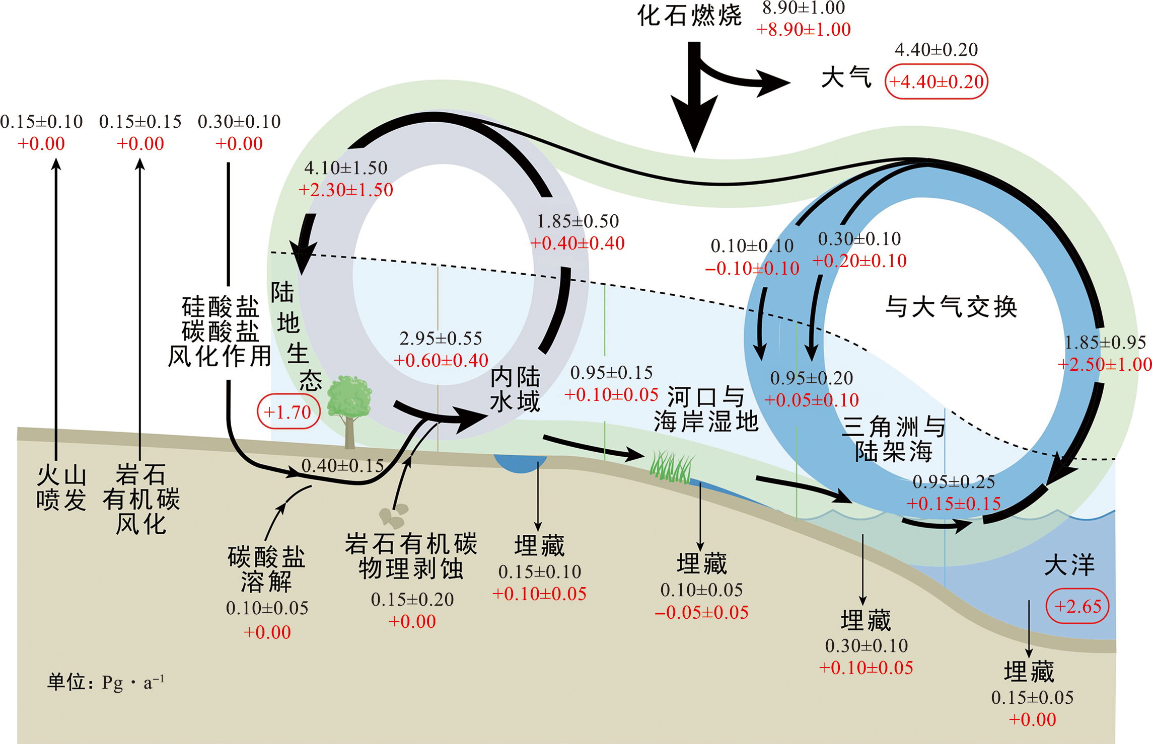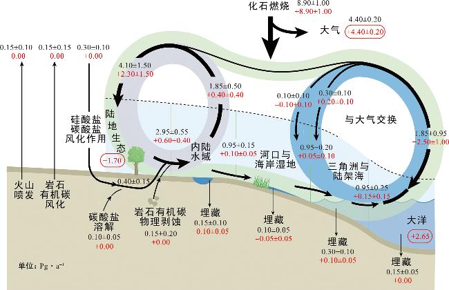 图1 综合考虑了陆地-海洋水生连续体(LOAC)碳循环通量的全球碳收支(图件改绘自文献[22]。图中黑色数字为现代碳循环通量估算值,红色数字是现代碳循环通量与工业革命前对应值对比的结果,+(-)分别代表增加或减少。) Fig.1 The global carbon budget incorporating carbon cycle fluxes of the land-to-ocean aquatic continuum (LOAC) (The figure is redrawn from reference [22]. The black numbers in the figure represent the estimated values of modern carbon cycle fluxes, while the red numbers represent the comparison results between modern carbon cycle fluxes and their corresponding values before the Industrial Revolution. The symbols “+” and “-” indicate an increase and a decrease, respectively.) |