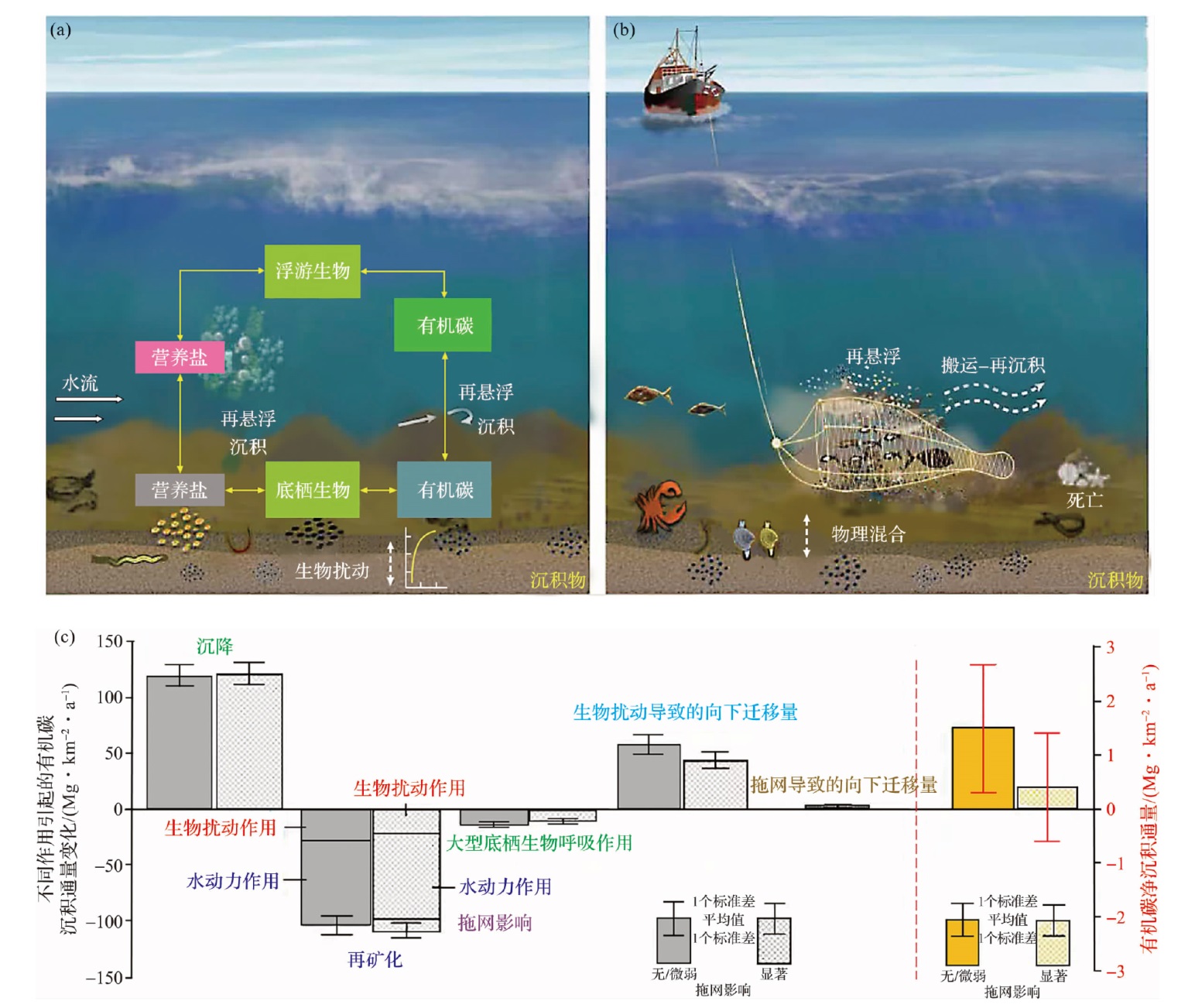 图6 底拖网对海洋沉积有机碳保存及通量的影响[a:自然情景下海洋底栖与浮游生物耦合作用对有机碳保存的影响;b:叠加底拖网作用下的情景;c:北海有/无底拖网作用两种情景下,模拟计算得到的不同作用(沉降、再矿化、大型底栖生物呼吸作用、生物扰动和底拖网)引起的有机碳沉积或丢失通量(左侧),和它们累计作用的有机碳净沉积通量(右侧)。图件改绘自文献[97]。] Fig.6 Impacts of bottom trawling on the preservation and flux of marine sedimentary organic carbon [a: Benthic-pelagic coupling in a natural system; b: Processes involved in bottom trawling; c: Model-estimated source and sink terms of OC in surface sediments in the No-trawling and trawling scenarios of the North Sea through different processes including deposition, remineralization, macrobenthos respiration, bioturbation and trawling-induced downward transport (left), and their cumulative OC deposition fluxes. The figure is redrawn from reference [97].] |