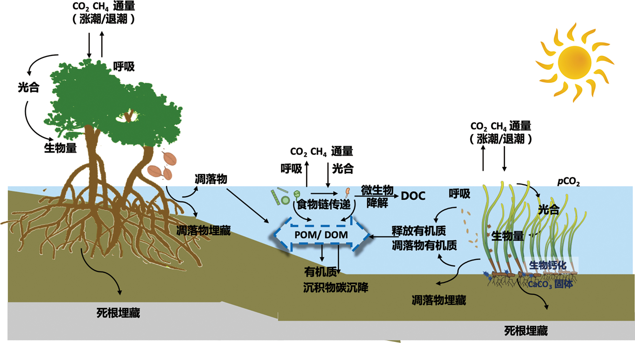 [73]。在潮汐作用下,红树林以POC等形式向近岸海水输出的碳量,可占其沉积物固碳总量的50%以上