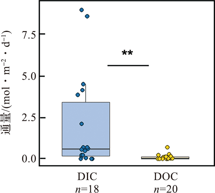 [77-79],红树林通过地下水交换输出的DIC和DOC通量分别为1.99±0.67 mol·m
