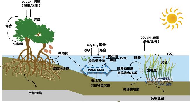 [17]。由于红树林与其他蓝碳生态系统间的碳交换通常基于碳储量与总生产力之间的差值间接估算,而现有研究缺乏对连续体间碳交换过程的解析,这可能导致红树林碳汇潜力的高估超过一半