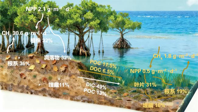 [72],但其固定的碳有相当一部分通过潮汐运动、孔隙水排放以及凋落物掉落等过程输出到邻近的水体中
